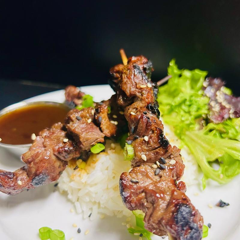 8oz. Teriyaki skirt steak, 2 eggs, hash browns or country potatoes