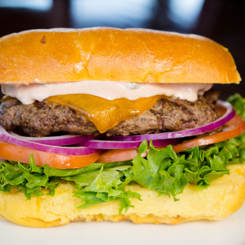 Filet mignon patty, one egg, avocado, cheddar cheese, bacon, pretzel bun, hash browns or country potatoes