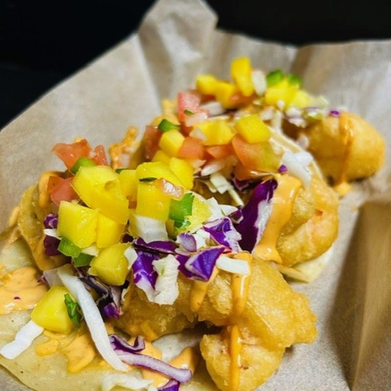 Beer battered rock shrimp, chipotle crema, cabbage, mango salsa