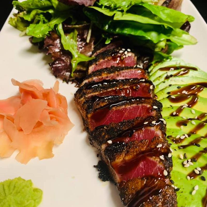 cajun, tsume, greens, soy-balsamic vinaigrette, avocado, ginger, wasabi, wonton